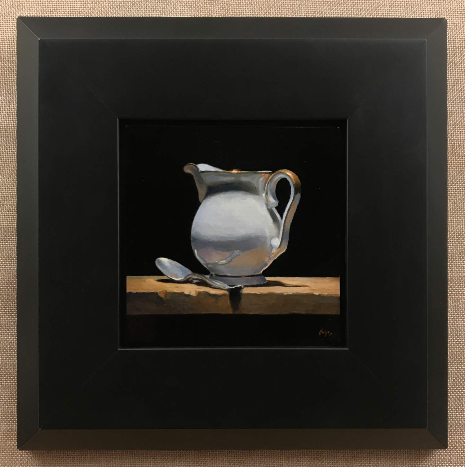 “Silver Spoon and Creamer” is an original still life painting, done with oil on panel.